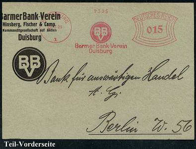 6865 | 15 € | 4100 Duisburg Absender-Freistempel : DUISBURG/ 1/ BBV/ Barmer-Bank-Verein.. 1929 (28.5.) AFS Francotyp "Bogenrechteck" klar auf Firmen-Teil-Vorderseite (Dü.E-1CAh = frühe C-Maschine!) | ![]() | |