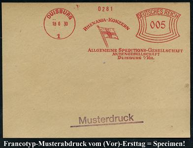 6869 | 35 € | 4100 Duisburg Absender-Freistempel : DUISBURG/ 1/ RHENANIA-KONZERN/ ALLGEM.SPEDITIONS-GESELLSCHAFT/ AG.. 1930 (18.6.) AFS-Musterabdruck Francotyp "Bogenrechteck" (Firmen-Flagge) glasklar gest. Francotyp-Musterblatt vom (Vor)-Ersttag!, selten! (Dü.E-1CEh) | ![]() ![]() | |