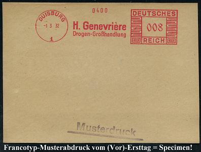 6873 | 35 € | 4100 Duisburg Absender-Freistempel : DUISBURG/ 1/ H.Genevrière/ Drogen-Großhandlung 1932 (1.3.) AFS-Musterabdruck Francotyp "Mäanderrechteck" , glasklar gest. Francotyp-Musterblatt vom (Vor)-Ersttag!, selten! (Dü.E-2CEh) | ![]() ![]() | |