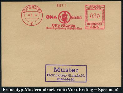6878 | 35 € | 4100 Duisburg Absender-Freistempel : DUISBURG/ 1/ OKA Fabrikate/ Otto Klepzig/ Lebensmittelgroßhandlung u.Kaffeegroßrösterei 1934 (8.8.) AFS-Musterabdruck Francotyp "Hakenkreuz" (Firmen-Logo) glasklar gest. Francotyp-Musterblatt vom (Vor)-Ersttag !, selten! (Dü.E-3CEh) | ![]() ![]() | |