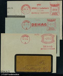 6879 | 30 € | 4100 Duisburg Absender-Freistempel : DUISBURG/ 1 #bzw.# DUISBURG-HAMBORN/ DEMAG.. 1934/42 3 verschiedene AFS Francotyp "Bogenrechteck" bzw. "Reichsadler" = Stahl-Konzern, Rüstungsbetrieb (Hersteller von Schützenpanzern etc.) 3 TeilVorderseiten, 3 Belege (Dü.E-1Ah, E-5DGh, E-5CEh) | ![]() | |