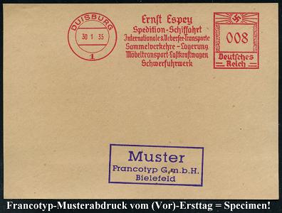 6880 | 35 € | 4100 Duisburg Absender-Freistempel : DUISBURG/ 1/ Ernst Espey/ Spedition-Schiffahrt/ Jnternat.& Uebersee-Transporte.../ Schwerfuhrwerk 1935 (30.1.) AFS-Musterabdruck Francotyp "Hakenkreuz" , glasklar gest. Francotyp-Musterblatt vom (Vor)-Ersttag!, selten! (Dü.E-3CEo) | ![]() ![]() | |