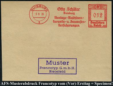 6881 | 35 € | 4100 Duisburg Absender-Freistempel : DUISBURG/ 1/ Otto Schöter/ ..Montage-Maschinen-/ Garantie-u.Bauwesen-/ Versicherungen 1935 (5.9.) AFS-Musterabdruck Francotyp "Hakenkreuz" , glasklar gest. Francotyp-Musterblatt vom (Vor)-Ersttag!, selten! (Dü.E-3CEo) | ![]() ![]() | |