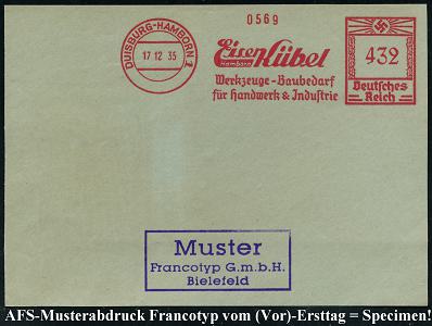 6883 | 35 € | 4100 Duisburg Absender-Freistempel : DUISBURG-HAMBORN 1/ Eisen Kübel/ Werkzeug-Baubedarf/ für Handwerk & Jndustrie 1935 (17.12.) AFS-Musterabdruck Francotyp "Hakenkreuz" , glasklar gest. Francotyp-Musterblatt vom (Vor)-Ersttag!, selten! (Dü.E-3CEh) | ![]() ![]() | |