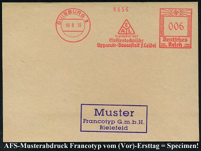 6884 | 35 € | 4100 Duisburg Absender-Freistempel : DUISBURG 1/ EAL../ Elektrotechn./ Apparate-Bauanstalt J.Leidel 1936 (10.8.) AFS-Musterabdruck Francotyp "Hakenkreuz" (Monogr.-Logo) glasklar gest. Francotyp-Musterblatt vom (Vor)-Ersttag !, selten! (Dü.E-3CEh) | ![]() ![]() | |