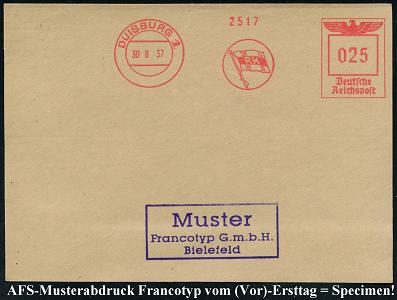 6888 | 35 € | 4100 Duisburg Absender-Freistempel : DUISBURG 1/ R K 1937 (30.8.) AFS-Musterabdruck Francotyp "Reichsadler" ohne Absender (Firmen-Flagge = Fa. Raab Karcher ?) glasklar gest. Francotyp-Musterblatt vom (Vor)-Ersttag !, selten! (Dü.E-5CGh) | ![]() ![]() | |