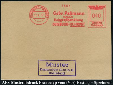 6890 | 35 € | 4100 Duisburg Absender-Freistempel : DUISBURG-RUHRORT/ Gebr.Paßmann/ GmbH/ Holzgroßhandlung.. 1937 (22.8.) AFS-Musterabdruck Francotyp "Reichsadler" , glasklar gest. Francotyp-Musterblatt vom (Vor)-Ersttag !, selten! (Dü.E-5CGh) | ![]() ![]() | |