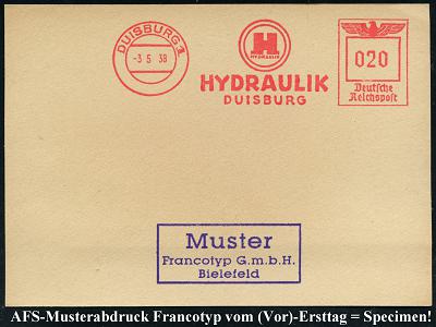 6892 | 35 € | 4100 Duisburg Absender-Freistempel : DUISBURG 1/ HYDRAULIK.. 1938 (3.5.) AFS-Musterabdruck Francotyp "Reichsadler" (Monogr.-Logo) glasklar gest. Francotyp-Musterblatt vom (Vor)-Ersttag !, selten! (Dü.E-5CGo) | ![]() ![]() | |