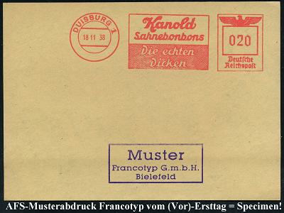 6893 | 35 € | 4100 Duisburg Absender-Freistempel : DUISBURG 1/ Knold/ Sahnebonbons/ Die echten/ Dicken 1938 (18.11.) AFS-Musterabdruck Francotyp "Reichsadler" , glasklar gest. Francotyp-Musterblatt vom (Vor)-Ersttag !, selten! (Dü.E-5CGo) | ![]() ![]() | |