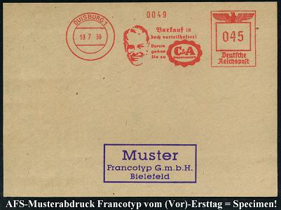 6895 | 35 € | 4100 Duisburg Absender-Freistempel : DUISBURG 1/ Barkauf ist/ doch vorteilhafter!/ ..C & A/ BRENNINKMEYER 1939 (18.7.) AFS-Musterabdruck Francotyp "Reichsadler" (Männerkopf) = Textil-Kaufhaus, glasklar gest. Francotyp-Musterblatt vom (Vor)-Ersttag !, selten! (Dü.E-5CGh) | ![]() ![]() | |