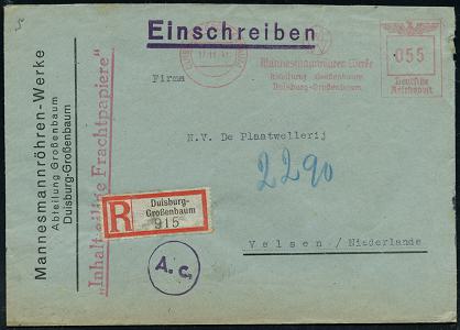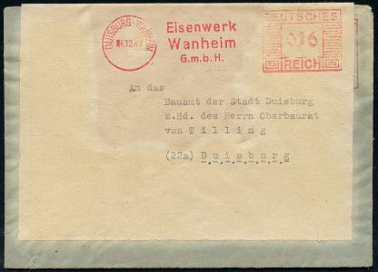 6897 | 30 € | 4100 Duisburg Absender-Freistempel : DUISBURG-GROSSENBAUM/ Mannesmannröhren Werke/ Abt.Großenbaum.. 1941 (17.11.) AFS Francotyp "Reichsadler" 055 Pf. + RZ: Duisburg-/Großenbaum + schw.-viol. OKW-Zensur-1K: A. c. = Köln (rs. Zensurstreifen entfernt, kl. Randkerbe) + roter 1L:" Inhalt: eilige Frachtpapiere", Ausl.-Zensur-R-Bf. (unten schwache Bräunung) n. Velsen, seltene Portostufe (Dü.E-5CGo) | ![]() | |