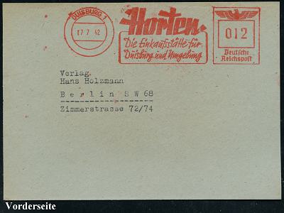6898 | 12 € | 4100 Duisburg Absender-Freistempel : DUISBURG 1/ Horten/ Die Einkaufsstätte für/ Duisburg u.Umgebung 1942 (7.7.) AFS Francotyp "Reichsadler" (= Kaufhaus) kleine Bedarfs-Vorderseite (Dü.E-5CGo) | ![]() | |