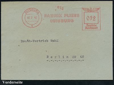 6899 | 12 € | 4100 Duisburg Absender-Freistempel : DUISBURG/ 1/ FABRIK FLIESS... 1942 (7.7.) AFS Francotyp "Reichsadler" , klar gest., kleine Bedarfs-Vorderseite (Dü.E-5CEh) | ![]() | |