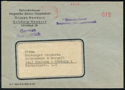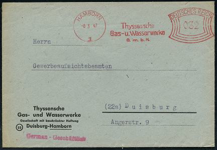 6911 | 30 € | 4100 Duisburg Absender-Freistempel : Duisburg-Hamborn 1 1947 (8.3.) AFS Francotyp "Bogenrechteck": HAMBORN 1/Thyssen´sche/Gas-u. Wasserwerke/GmbH unverändert weiterverwendet mit Inschrift "DEUTSCHES REICH" = Notmaßnahme! , 032 Pf. auf Orts-Doppel-Bf.! (Dü.E-1CEh, unverändert weiterverwendet) | ![]() | |