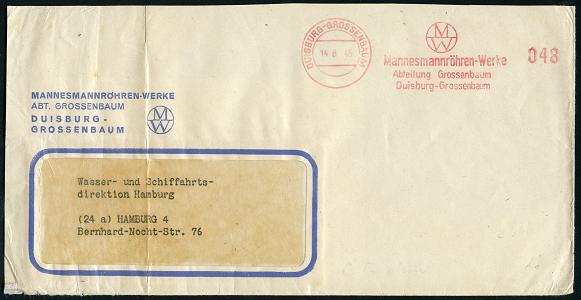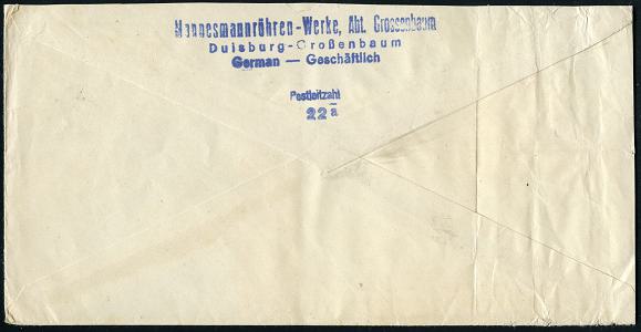 6908 | 20 € | 4100 Duisburg Absender-Freistempel : DUISBURG-GROSSENBAUM/ MW/ Mannesmannröhren-Werke/ Abtl.Grossenbaum.. 1946 (14.8.) seltener, total aptierter AFS Francotyp "Reichsadler", Wertrahmen total entfernt = Notmaßnahme! (Firmen-Logo) motivgl. Firmen-Bf. (Links gefaltet u. etw. verkürzt) , vergl. Kat.-Nr.6897 (Dü.E-16-242o) | ![]() ![]() | |