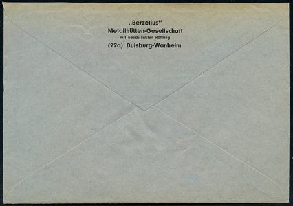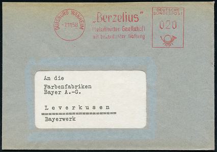 6918 | 16 € | 4100 Duisburg Absender-Freistempel : DUISBURG-WANHEIM/ "Berzelius"/ Metallhütten-Ges/ mbH 1958 (7.11.) AFS Francotyp (Berzelius = schwed. Chemiker, Atom- u.elektrochem.Theorien) rs. Abs.-Vordruck, Fern-Bf. (Bo.23BGo) | ![]() ![]() | |