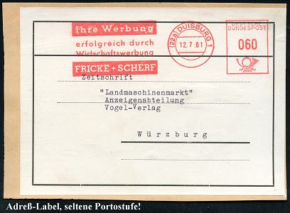 6922 | 28 € | 4100 Duisburg Absender-Freistempel : (22a) DUISBURG 1/ Ihre Werbung/ erfolgreich../ FRICKE + SCHERF 1961 (12.7.) AFS Francotyp 060 Pf. auf Adreß-Label = 3. Gew.-Stufe Fern-Bf. (Götz + 150.- DM, 1980), seltene Portostufe! (Dü.E-26) | ![]() | |
