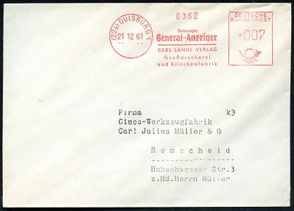 6923 | 12 € | 4100 Duisburg Absender-Freistempel : (22a) DUISBURG 1/ Duisburger/ General-Anzeiger/ CARL LANGE VERLAG/ Großdruckerei.. 1961 (21.12.) AFS Francotyp mit alter Zählnr. , Fern-Bf. (Dü.E-23DOh) | ![]() | |