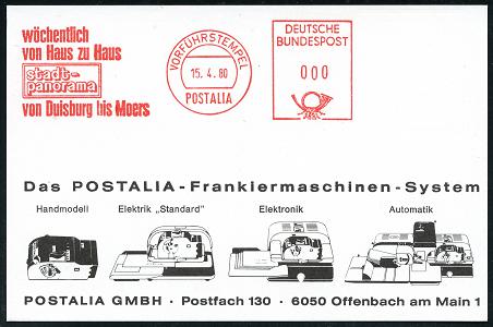 6931 | 18 € | 4100 Duisburg Absender-Freistempel : Duisburg / Moers 1980 (15.4.) AFS: POSTALIA/VORFÜHRSTEMPEL/wöchentlich/von Haus zu Haus/stadt-/panorama.. , seltene Postalia-Musterkarte! (= Specimen) | ![]() | |