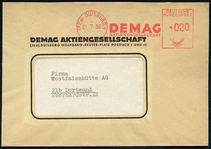 6917 | 15 € | 4100 Duisburg Absender-Freistempel : (22a) DUISBURG 1/ DEMAG/ AG 1958 (21.7.) AFS Francotyp "Posthorn" klar auf Firmen-Bf. (Dü.E-23DO mit Raute) | ![]() | |