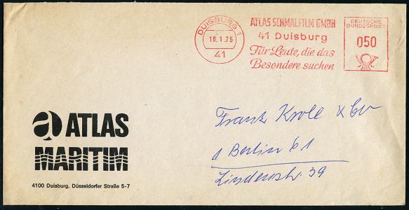6928 | 14 € | 4100 Duisburg Absender-Freistempel : 41 DUISBURG 1/ ATLAS SCHMALFILM GMBH/ ..Für Leute,die das/ Besondere lieben 1975 (16.1.) AFS Francotyp , dekorativer Firmen-Bf. mit Logo n. West-Berlin (Dü.E-23CO) | ![]() | |