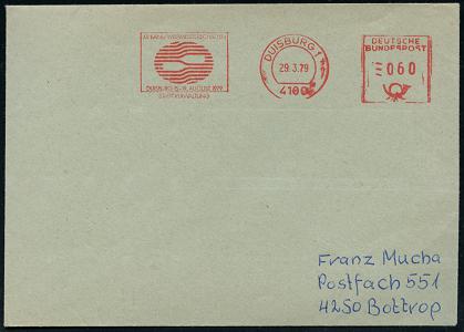 6930 | 14 € | 4100 Duisburg Absender-Freistempel : 4100 DUISBURG 1/ XV.KANU-WELTMEISTERSCHAFTEN/ ..STADTVERWALTUNG 1979 (29.3.) AFS Typ Pitney Bowes (2 Ruder = Logo) klar gest. Inl.-Bf., vergl. Kat.-Nr. 6929 (Dü.E-26E, nur kurze Verwendungszeit) | ![]() | |