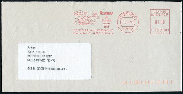 6934 | 10 € | 4100 Duisburg Absender-Freistempel : 47051 DUISBURG 1/ F70 0303/ kanu/ Paddel/ doch/ mal/ DEUTSCHER KANU VERBAND e.V. 1998 (16.6.) AFS Postalia mit Kennung (Kajakfahrer) klar gest. Fern-Bf. (Dü.E-26B) | ![]() | |