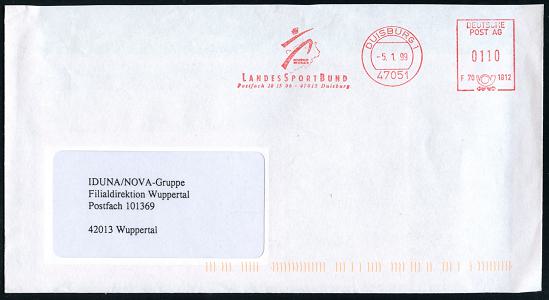 6935 | 8 € | 4100 Duisburg Absender-Freistempel : 47051 DUISBURG 1/ F70 1812/ LANDESSPORTBUND/ NORDRHEIN/ WESTFALEN 1999 (5.1.) AFS Postalia "Deutsche Post AG" mit Kennung (Logo) Fern-Bf. (Dü.E-26B) | ![]() | |