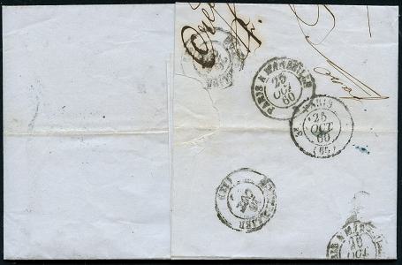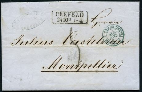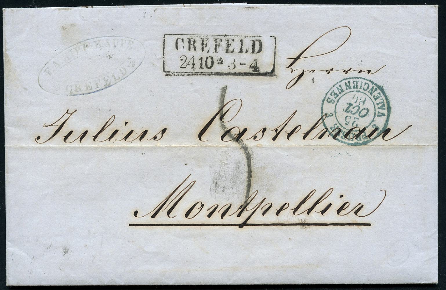7042 | 25 € | 4150 Krefeld allgem. Belege, Tages-, Sonder- u. Maschinenstempel etc. : Krefeld 1860 (24.10.) schw. Ra.2: CREFELD/* ohne Jahr + blauer Grenzübergangs-2K: PRUSSE/3/VALENCIENNES, klar gest. Ausl.-Firmenbf. (Fa. Hipp-Kaupe) mit Inhalt n. Montpellier, rs. div. TS/AS | ![]() ![]() | |
