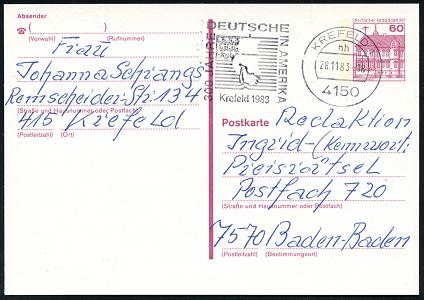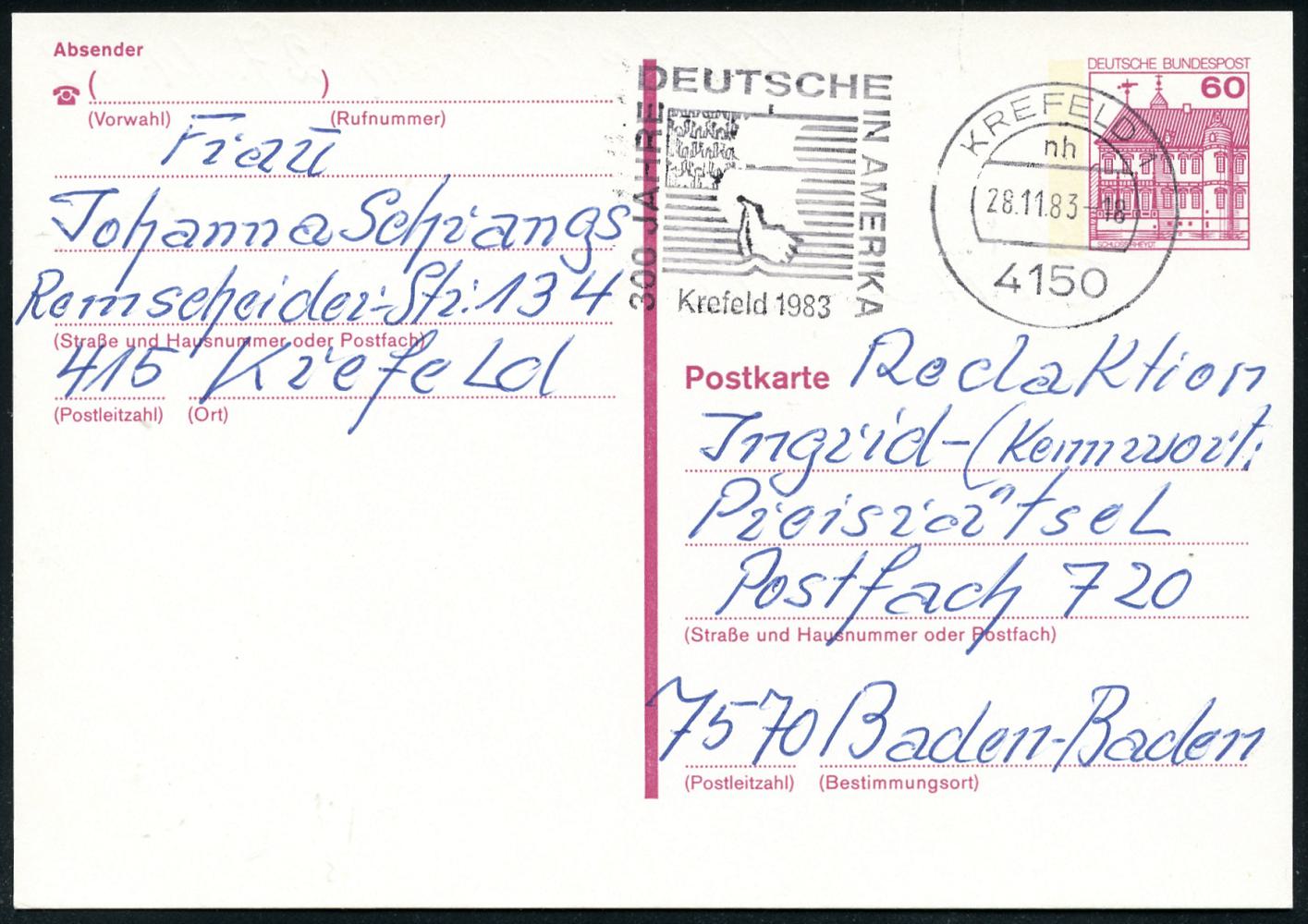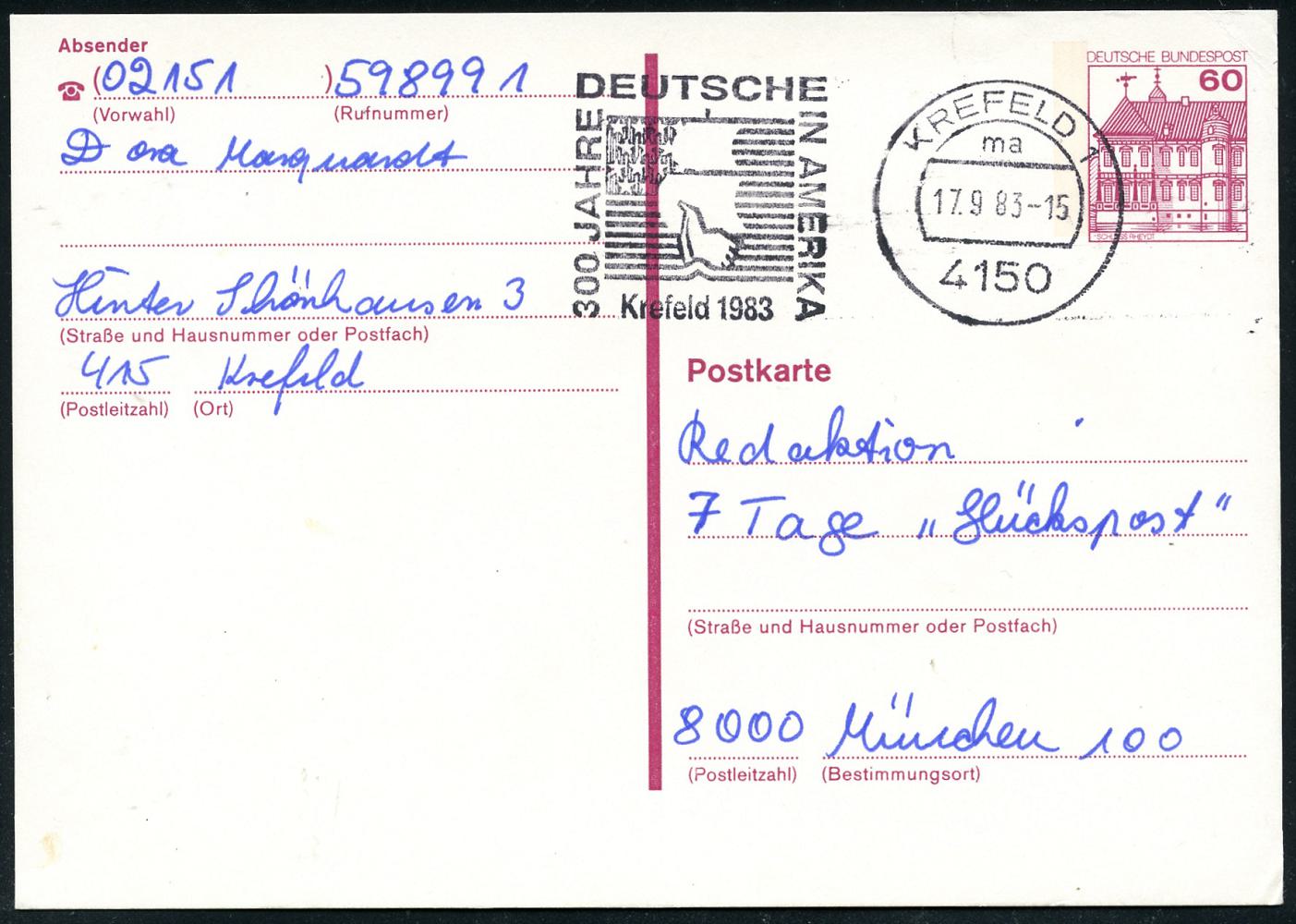 7053 | 10 € | 4150 Krefeld allgem. Belege, Tages-, Sonder- u. Maschinenstempel etc. : 4150 KREFELD 1/ ma #bzw.#nh/ 300 JAHRE/ DEUTSCHE/ IN AMERIKA 1983 2 verschiedene MWSt = US-Flagge, Segelschiff klar auf 2 Bedarfskarten (Einzelverkauf möglich: je 6.- EUR), 2 Bedarfs-Belege (Bo.71 A I, II) | ![]() ![]() | |