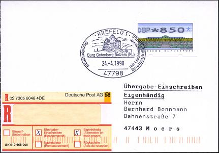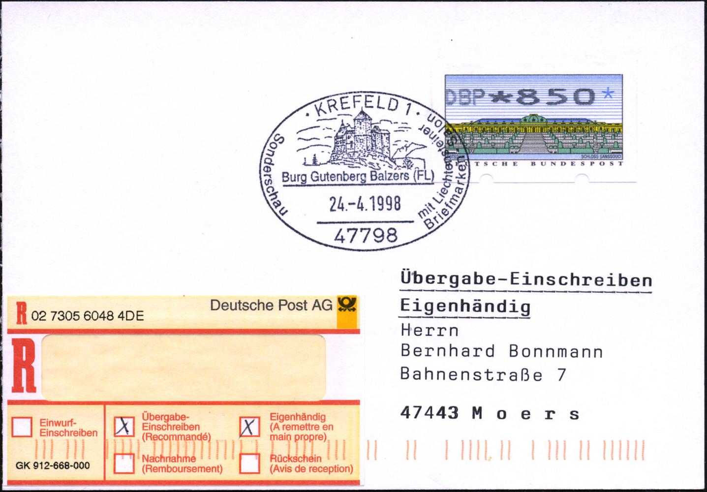 7055 | 20 € | 4150 Krefeld allgem. Belege, Tages-, Sonder- u. Maschinenstempel etc. : 47798 KREFELD 1/ Burg Gutenberg Balzers (FL)/ ..Briefmarkensalon 1988 (24.4.) SSt = Burg Gutenberg auf EF 850 Pf. ATM "Schloß Sanssouci" + Selbstklebe-RZ = Versuchs-Phase + orange Strichcodierung, portorichtige R-Kt. "Eigenhändig", seltene Portostufe! | ![]() | |