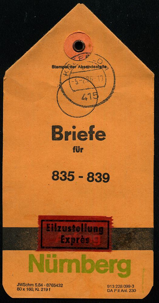 7056 | 14 € | 4150 Krefeld allgem. Belege, Tages-, Sonder- u. Maschinenstempel etc. : 415 KREFELD 1/ be 1986 (5.2.) 1K-Segment + Express-Label auf Postsack-Anhänger: Briefe für 835 - 839 Nürnberg (orange/schw./grün) | ![]() | |