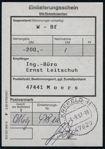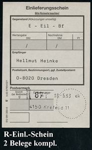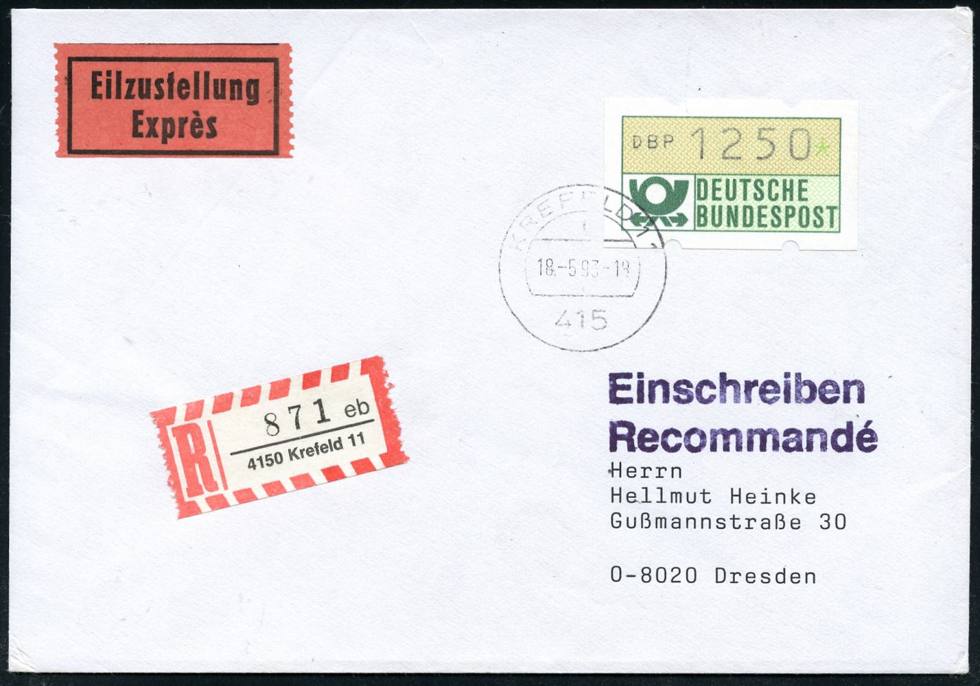 7057 | 18 € | 4150 Krefeld allgem. Belege, Tages-, Sonder- u. Maschinenstempel etc. : 415 KREFELD 1/ t 1993 (18.5.) 1K-Segment auf ATM 1250 Pf., EF + RZ: 4150 Krefeld 11/e b + R-Einl.-Schein mit Paginier-Stempel, portorichtiger Inl.-Eil-R-Bf., seltene Portostufe!, 2 Belege kompl.! (Mi.1) | ![]() ![]() | |