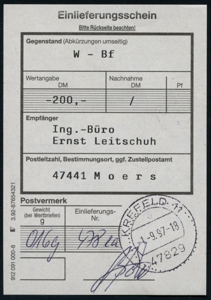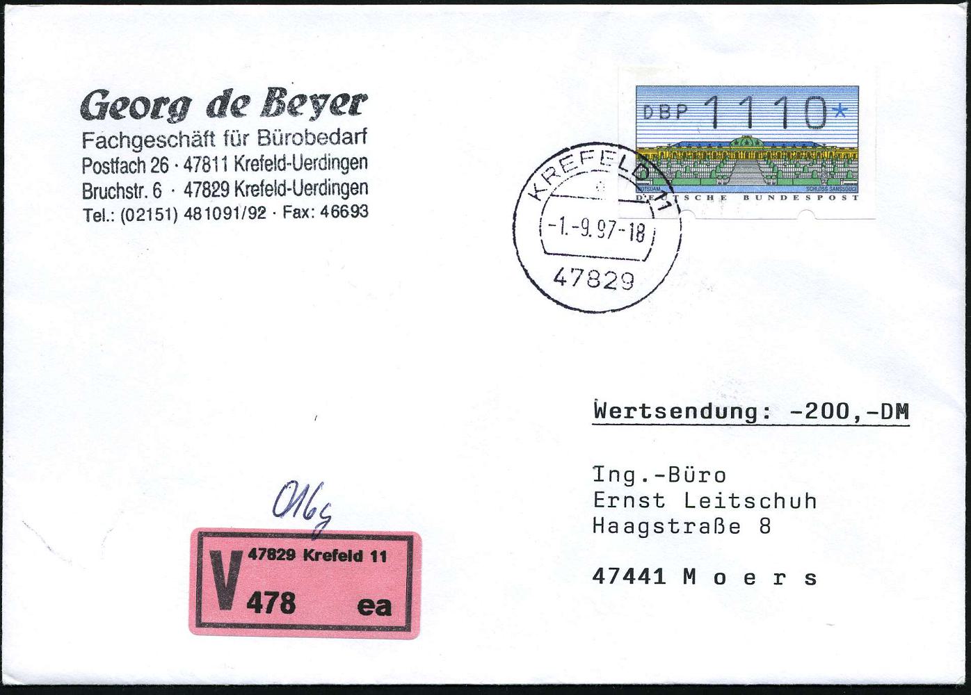 7061 | 18 € | 4150 Krefeld allgem. Belege, Tages-, Sonder- u. Maschinenstempel etc. : 47829 KREFELD 11 1997 (1.9.) 1K-Segment auf EF ATM 1110 Pf. "Schloß Sanssouci", , klar gest. + rosa Selbstklebe-VZ: 47829 Krefeld 11/e a + Wert-Einl.-Schein, Inl.-Wert-Bf. "200.- DM", 2 Belege kompl.! (Mi.ATM 2 EF) | ![]() ![]() | |