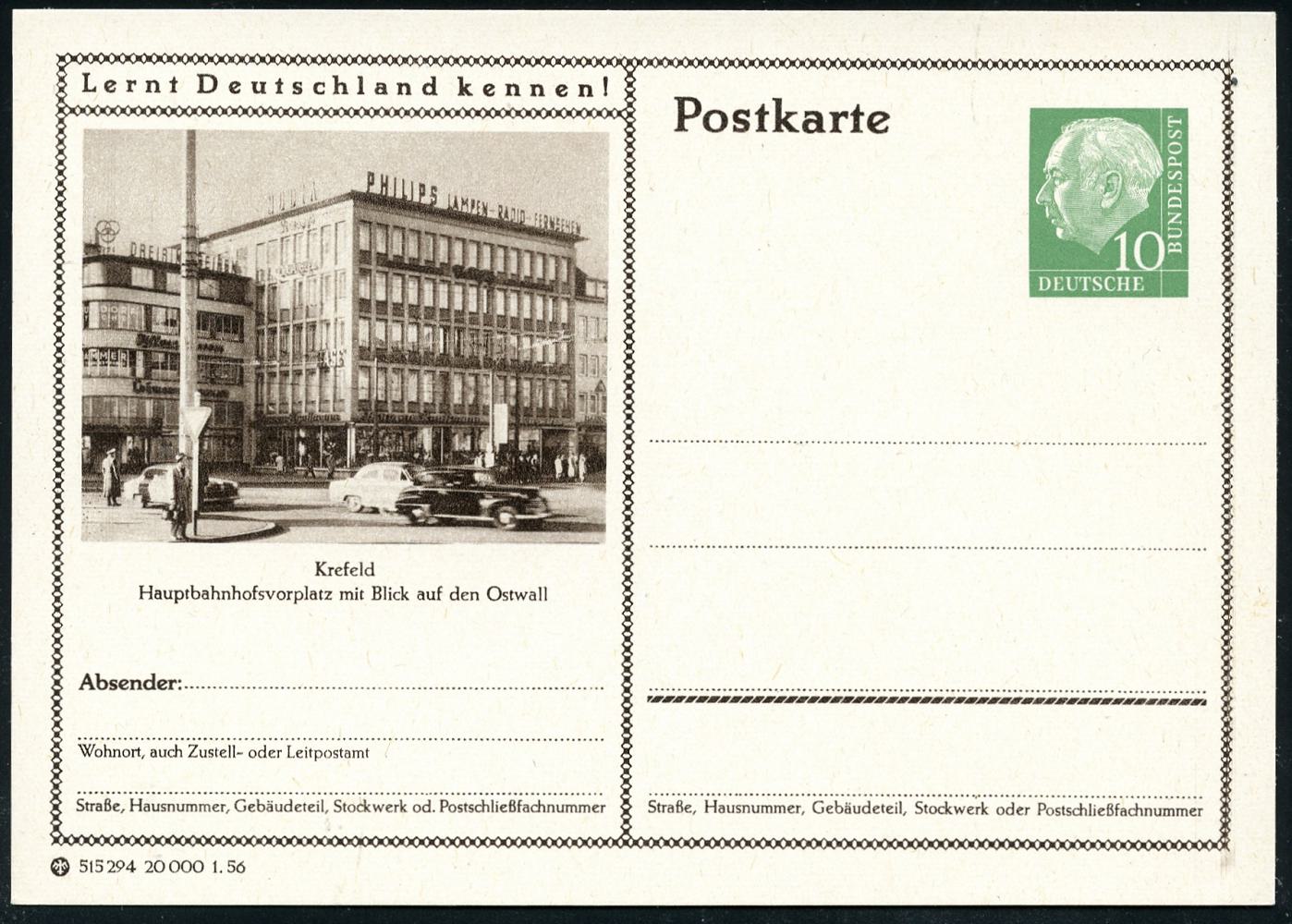 7050 | 5 € | 4150 Krefeld allgem. Belege, Tages-, Sonder- u. Maschinenstempel etc. : Krefeld 1956 10 Pf. BiP Heuss I, grün: Hauptbahnhofvorplatz.. Ostwall (mit Philips-Haus) ungebr. (Mi.P 24) | ![]() | |
