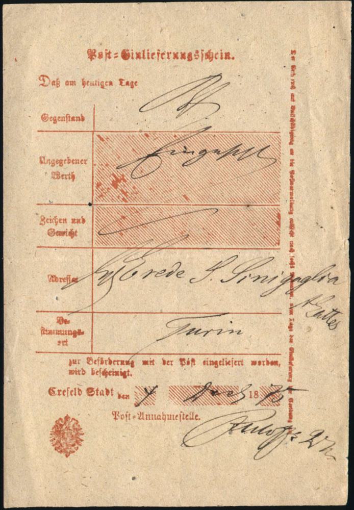 7044 | 18 € | 4150 Krefeld allgem. Belege, Tages-, Sonder- u. Maschinenstempel etc. : Krefeld 1875 (4.12.) Post-Einlieferungsschein Ortsdruck: Crefeld Stadt (Adler) für Auslands-Sendung n. Turin! | ![]() | |