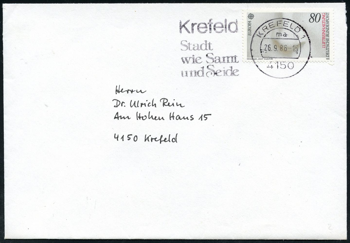 7054 | 10 € | 4150 Krefeld allgem. Belege, Tages-, Sonder- u. Maschinenstempel etc. : 4150 #bzw.# 415 KREFELD 1/ ma #bzw.# nb/ Stadt/ wie Samt/ u.Seide 1986/91 2 verschiedene MWSt klar auf 2 Bedarfs-Briefen | ![]() ![]() | |