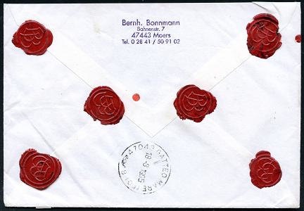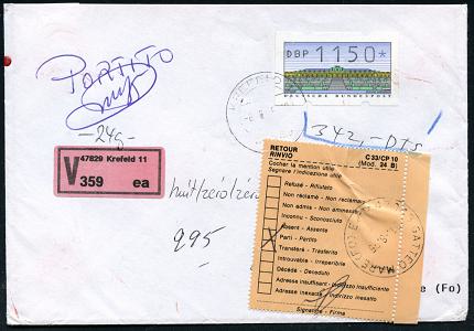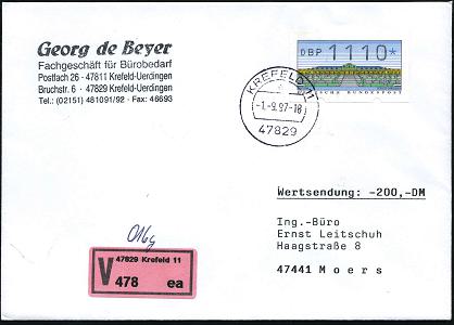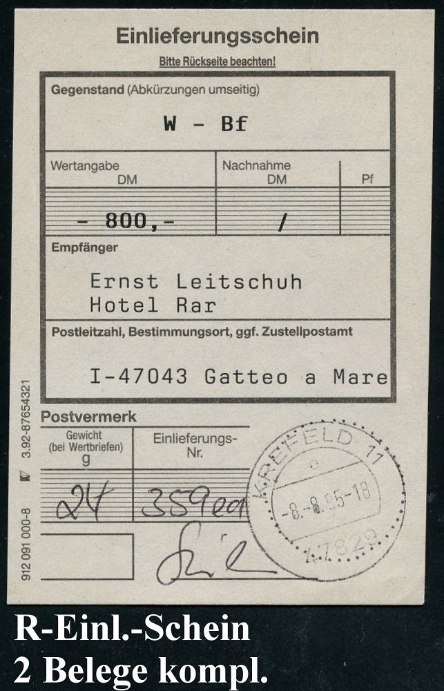 7060 | 20 € | 4150 Krefeld allgem. Belege, Tages-, Sonder- u. Maschinenstempel etc. : 47829 KREFELD 11/ e 1995 (8.8.) 1K-Segment auf EF ATM Schloß Sanscouci 1150 Pf. + Selbstklebe-V-Zettel: 47829 Krefeld 11 / e a + gl. Stpl. auf Wert-Einl.-Schein, gesiegelter Ausl.-Wert-Retour-Bf. n. Italien, italien. Retour-Zettel, seltene Portostufe!, 2 Belege kompl.! | ![]() ![]() ![]() | |