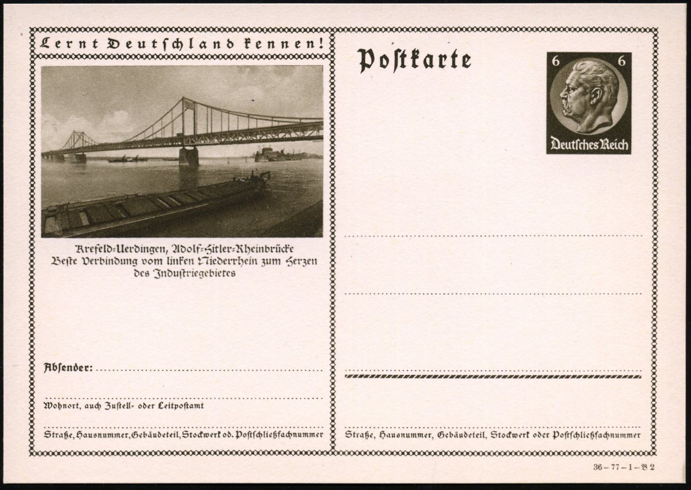 7048 | 6 € | 4150 Krefeld allgem. Belege, Tages-, Sonder- u. Maschinenstempel etc. : Krefeld-Uerdingen 1936 6 Pf. BiP Hindenbg., braun: Adolf-Hitler-Rheinbrücke (Hängebrücke) ungebr. (Mi.P 236/36-77-1-B 2) | ![]() | |