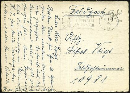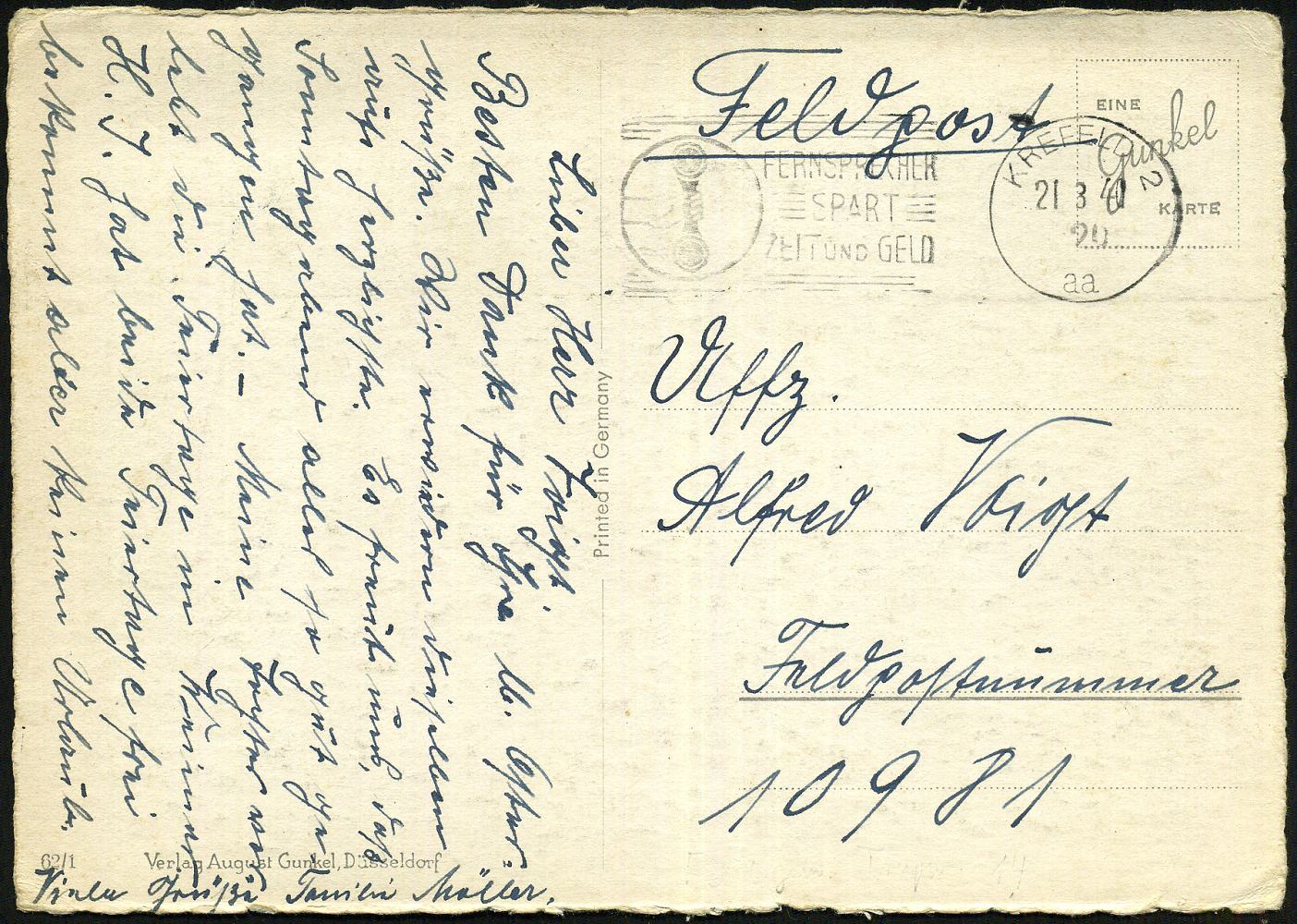 7049 | 12 € | 4150 Krefeld allgem. Belege, Tages-, Sonder- u. Maschinenstempel etc. : KREFELD 2/ aa/ FERNSPRECHER/ SPART/ ZEIT u.GELD 1940 (21.3.) MWSt (Telefonhörer) auf Oster-Feldpost-Ak. an Fp.Nr. 10981 = Feld-Gendarmerie-Trupp 14 (Bo.S 102 A) | ![]() | |