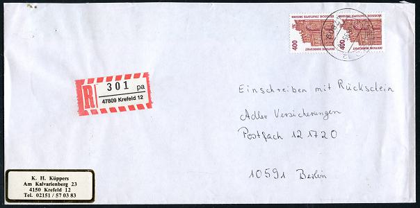7058 | 12 € | 4150 Krefeld allgem. Belege, Tages-, Sonder- u. Maschinenstempel etc. : 47809 KREFELD 12/ a 1995 (2.6.) 1K-Segment auf senkr. Paar 400 Pf. Semperoper + RZ: 47809 12/pa , Inl.-R-Bf. (Mi.1562 MeF) | ![]() | |