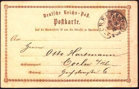 7043 | 20 € | 4150 Krefeld allgem. Belege, Tages-, Sonder- u. Maschinenstempel etc. : Krefeld 1873 (13.11.) Hufeisen-Stpl.: - CREFELD - klar auf Inl.-P 1 /2 Gr. Wappen n. Köln (Mi.P 1) | ![]() | |