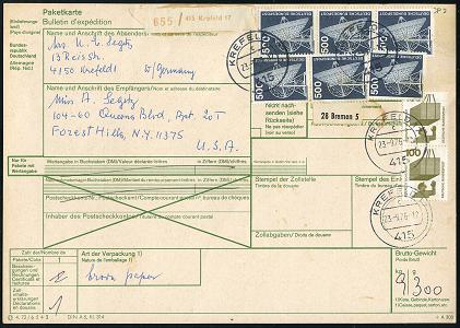 7052 | 18 € | 4150 Krefeld allgem. Belege, Tages-, Sonder- u. Maschinenstempel etc. : 415 KREFELD 17/ c 1976 (23.9.) 1K-Segment 4x auf 6x 500 Pf. Technik Radioteleskop + 2x 100 Pf. Unfall + brauner Paketzettel: 415 Krefeld 17, klar gest. Übersee-Paket-Kt. n. USA, Portostufe 37.- DM-Frankatur! (Mi. 2x 702, 6x 859) | ![]() | |