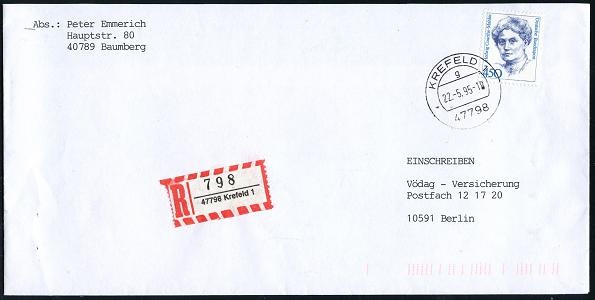 7059 | 10 € | 4150 Krefeld allgem. Belege, Tages-, Sonder- u. Maschinenstempel etc. : 47798 KREFELD 1/ g 1995 (22.5.) 1K-Segment auf EF 450 Pf. Frauen (H. Courths-Mahler = Autorin) + RZ: 47798 Krefeld 1, klar gest. Inl.-R-Bf. (Mi.1614 EF) | ![]() | |
