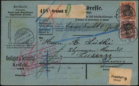 7045 | 25 € | 4150 Krefeld allgem. Belege, Tages-, Sonder- u. Maschinenstempel etc. : Krefeld 1901 (19.6.) 1K-Gitter: CREFELD/* 2 c 3x auf 30 Pf. u. 50 Pf. Germania "REICHSPOST" + schw. Paketzettel: Crefeld 2 etc. (Fa. Oediger & Schmitz), klar gest. Ausl.-Paket-Kt. n. Luzern (Mi.59, 61 + 26.- EUR) | ![]() | |