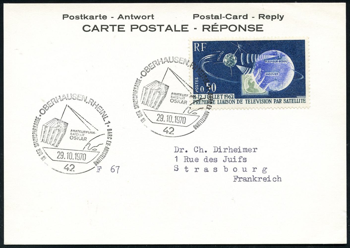 7099 | 20 € | 4200 Oberhausen allgem. Belege, Tages-, Sonder- u. Maschinenstempel etc. : 42 OBERHAUSEN,RHEINL 1/ DARC../ AMATEURFUNK-/ SATELLIT/ "OSKAR" 1970 (29.10.) seltener SSt (= Satellit "Oskar", Funksignal) auf EF Frankreich 0,50 Fr. "Telstar", zulässige Ausl.-Antwortkt. n. Frankreich!, Unikat! (Bo.51) | ![]() | |