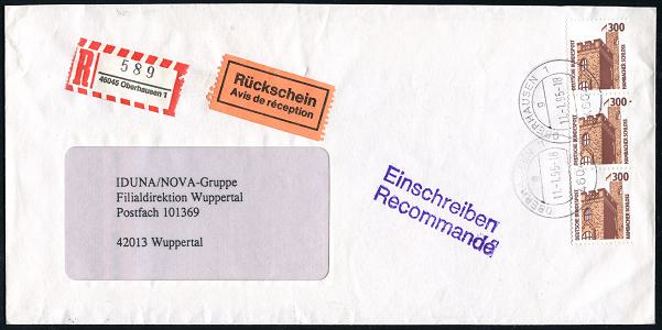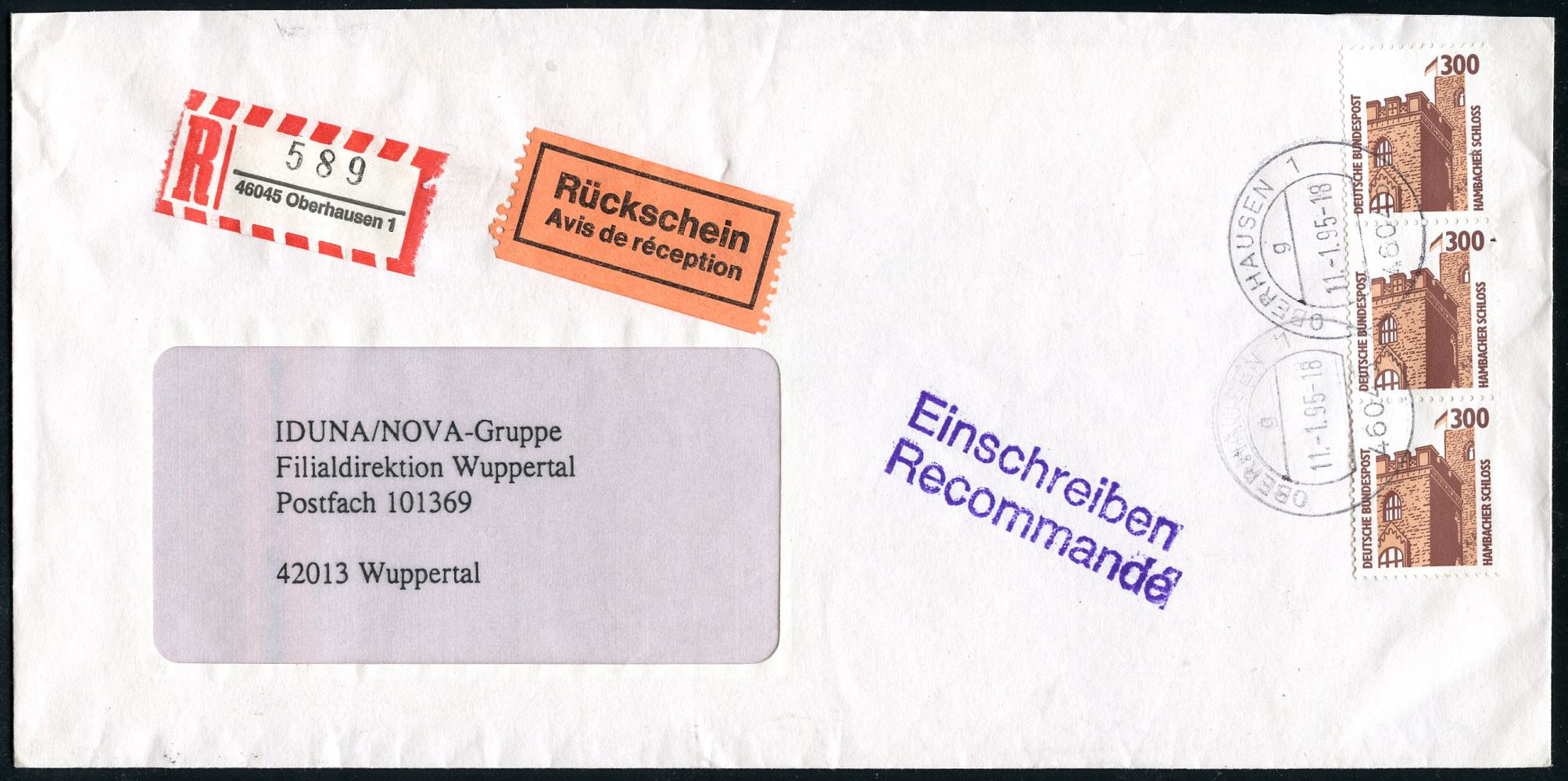 7104 | 25 € | 4200 Oberhausen allgem. Belege, Tages-, Sonder- u. Maschinenstempel etc. : 46045 OBERHAUSEN 1/ g 1995 (11.1) 1K-Segm. auf MeF 300 Pf. Hambacher Schloß: 3er-Streifen , vertikal + RZ: 45045 Oberhausen 1, klar gest. Inl.-R-Bf. "Rückschein" portorichtig = 900 Pf.!, seltene Portostufe! (Mi.1348 MeF, + 42.- EUR) | ![]() | |
