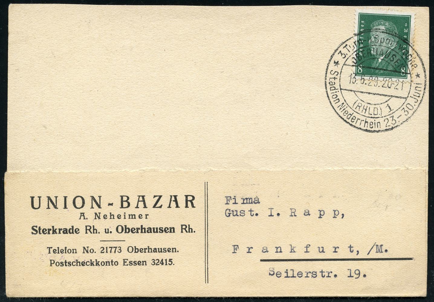 7096 | 23 € | 4200 Oberhausen allgem. Belege, Tages-, Sonder- u. Maschinenstempel etc. : OBERHAUSEN/ (RHLD.) 1/ *3.Turn-u.Sportwoche*/ Stadion Niederrhein 23.-30.Juni 1929 (13.6.) HWSt klar auf Firmen-Kt.: UNION-BAZAR, A. Neheimer, Sterkrade u. Oberhausen.. (Bo.4 Type II = * *) | ![]() | |