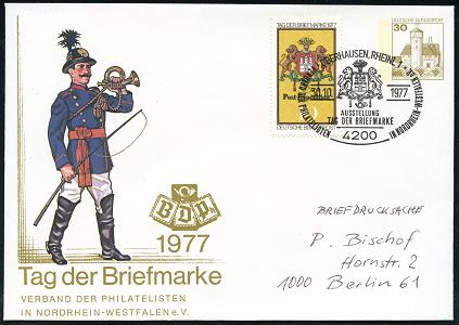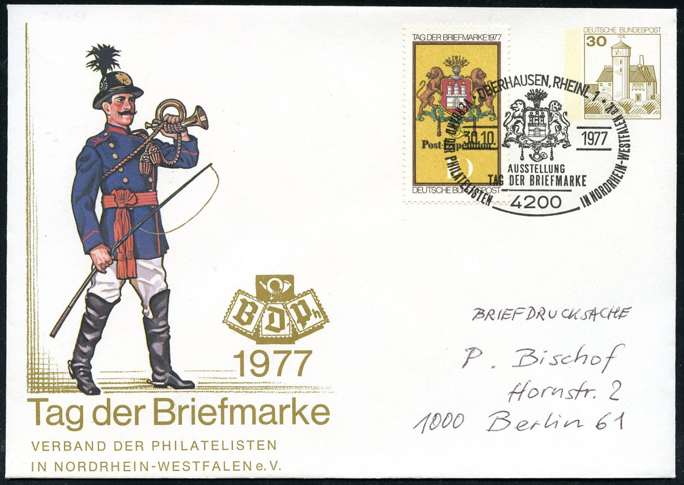 7100 | 10 € | 4200 Oberhausen allgem. Belege, Tages-, Sonder- u. Maschinenstempel etc. : OBERHAUSEN,RHEINL1/ TAG DER BRIEFMARKE 1977 (30.10.) SSt. auf PU 30 Pf. Tag der Briefmarke Nordrhein-Westf. (Postillon) + 10 Pf. T.d.B. (Mi. 948) klar gest. Inl.-Bf. (Mi. PU 108/36 a) | ![]() | |