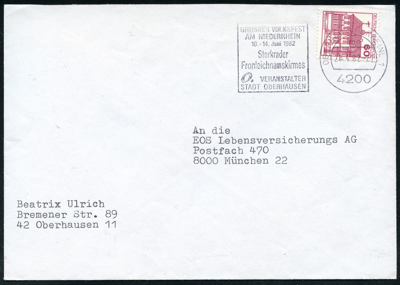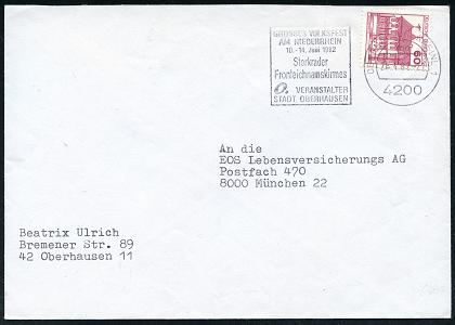 7103 | 6 € | 4200 Oberhausen allgem. Belege, Tages-, Sonder- u. Maschinenstempel etc. : 4200 OBERHAUSEN; RHEINL 1/ mo/ GROSSES VOLKSFEST../ Sterkrader/ Fronleichnamskirmes.. 1982 (26.4.) MWSt auf Bedarfs-Bf. | ![]() | |